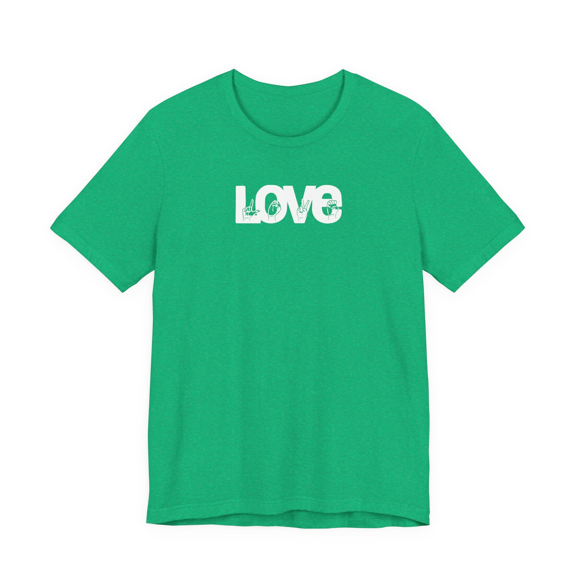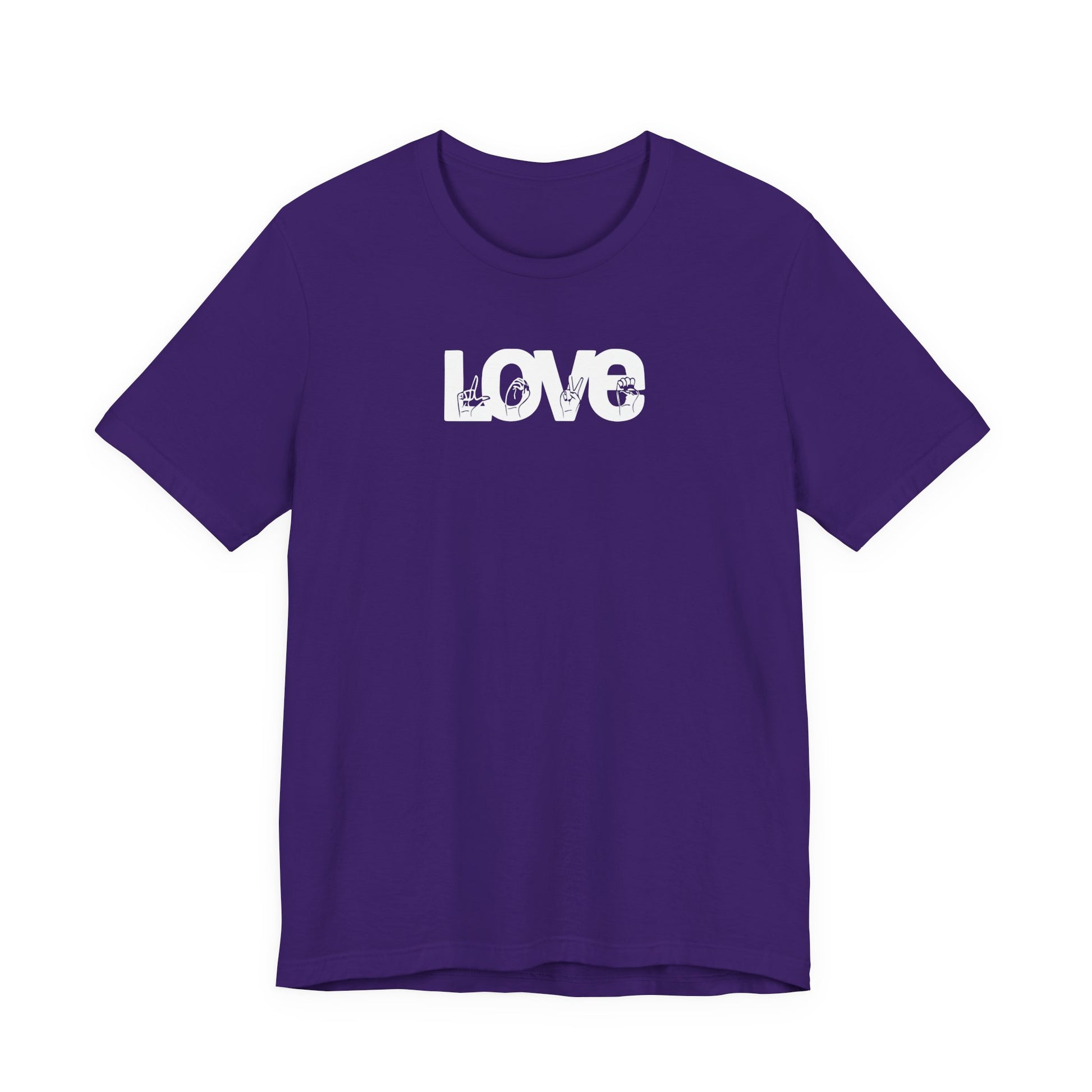 You are LOVE. Express it in ASL! Stand out among the rest in this unique, all white, peekaboo design variation that really pops against a bright rainbow of color choices! *We are a Deaf-Owned/ASL fluent business. This classic unisex jersey short sleeve tee fits like a well-loved favorite. Super soft cotton! These t-shirts have-ribbed knit collars to bolster shaping. The shoulders have taping for better fit over time. Dual side seams hold the garment's shape for longer. .: 100% Airlume combed and ringspun cotton (fiber content may vary for different colors) .: Light fabric (4.2 oz/yd² (142 g/m²)) .: Retail fit .: Tear away label .: Runs true to size